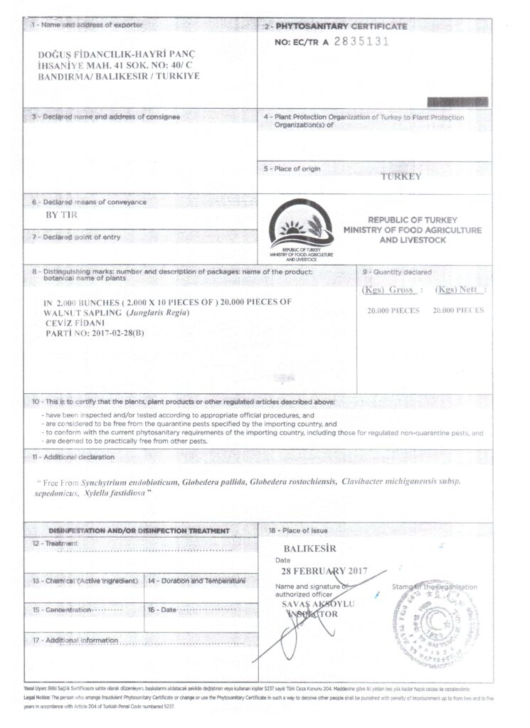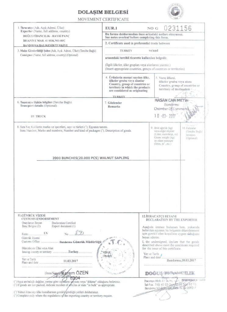 We send phytosanitary certificate , Euro-1 and other all important documents after we maket he customs procedure with saplings. Thanks to our 10 years export experience, our customers take their saplings without having any problems. You can see phytosanitary certificate and Euro-1 document in the documents section. There isn’t transport cost in the price which we will give. If our customers want, we find transporter and we pay transport cost by adding transport price to saplings’ price.